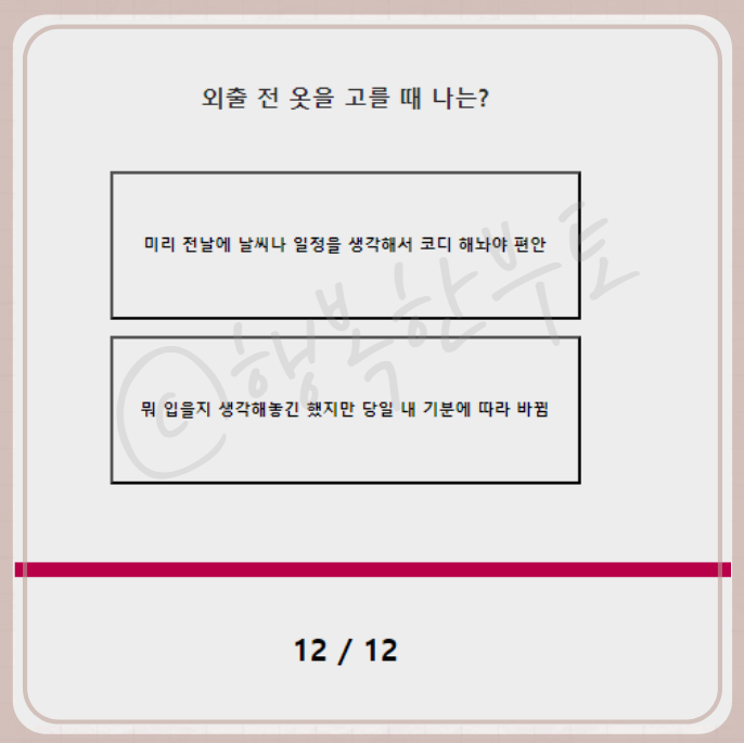 괴로울 것 같습니다. 다음 질문으로는 처음 보는 친구와 단둘이 있게 된다면 나는? 저는 어렸을 적부터 몇 번 만나지 않았던 사람과 함께 식사하는 것을 매우 꺼려했던 성향인지라 생각할 것도 없이 두 번째를 선택했습니다