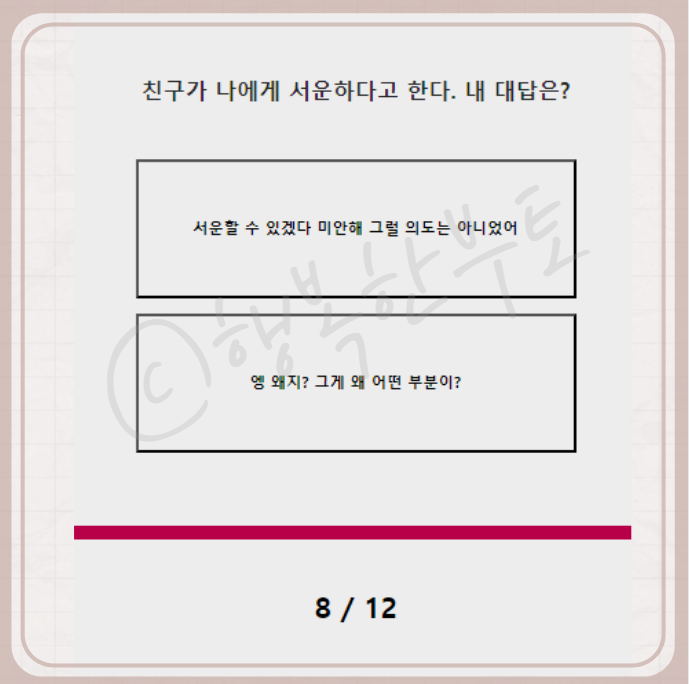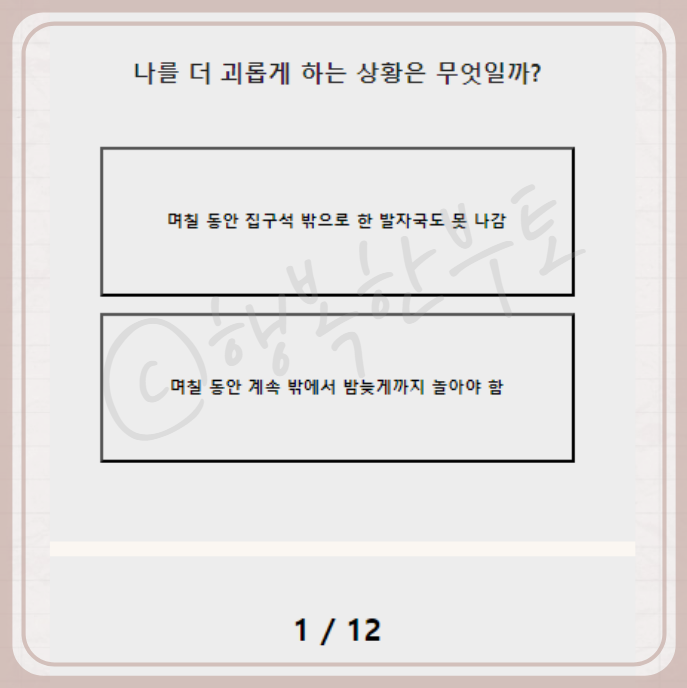 첫 번째 질문. 나를 더 괴롭게 하는 상황은 무엇일까?라는 질문이었습니다.