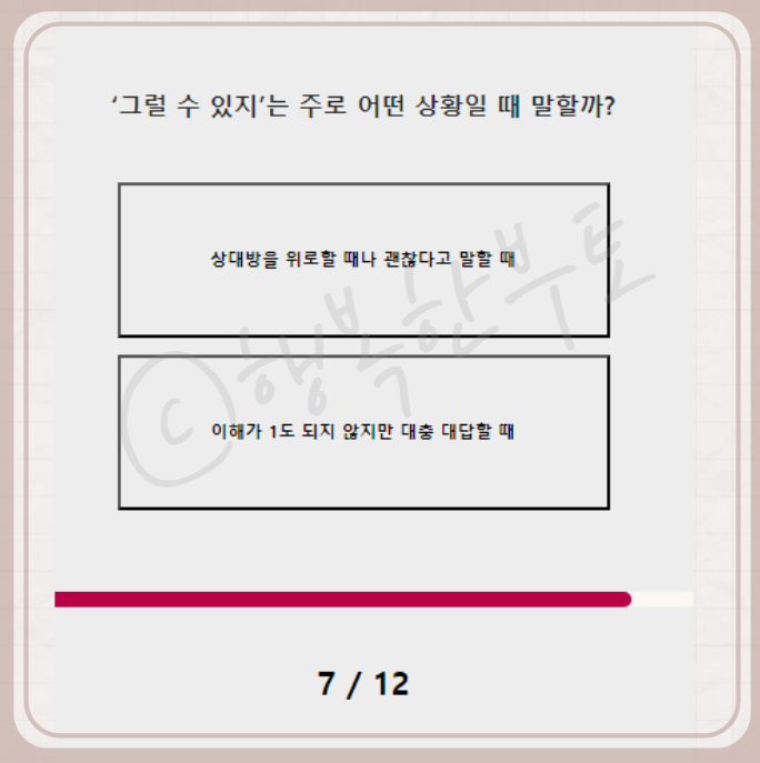 그럴 수 있지는 상대방을 위로할 때 나 괜찮다고 말할 때를 선택했는데 위로를 받고 싶지 않고 혼자 있고 싶거나 상대방이 위로를 하게 되면 자초지종을 이야기하게 되는데 그런 부분을 이야기하고 싶지 않을 때 괜찮아라고 말하면 보통은 혼자 있고 싶어, 나 아직 이 이야기를 말하고 싶지 않아로 이해하지 않나 싶어요.