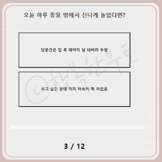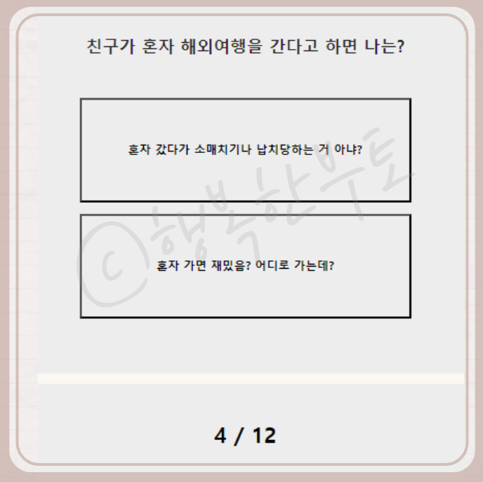 하루 종일 밖에서 신나게 놀았다면 당연히 당분간 집에서 휴식을 추하고 에너지를 충전해야지요. 사람들을 만나면 에너지가 많이 소모되는 편이라 첫 번째를 선택했습니다. 그리고 친구가 혼자 해외여행을 간다고 하면 걱정도 물론 되겠지만 혼자가면 재미있을까? 어디로 혼자가는지 더 궁금해 할 것 같습니다.