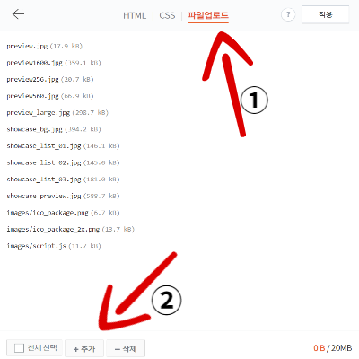 HTML / CSS / 파일업로드 3가지 중에서 파일업로드를 클릭 후 아래쪽에 +추가 버튼을 눌러주세요