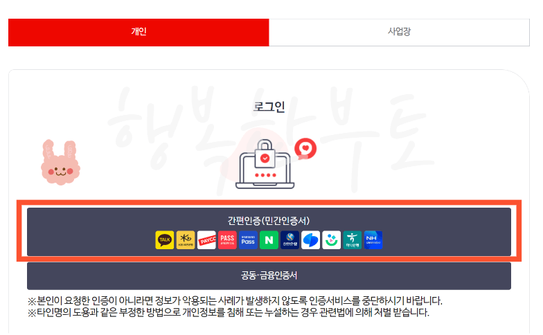 요즘 공동인증서 말고도 자기 명의의 휴대폰만 있다면 간편 인증을 통해 간편하게 로그인이 가능합니다.