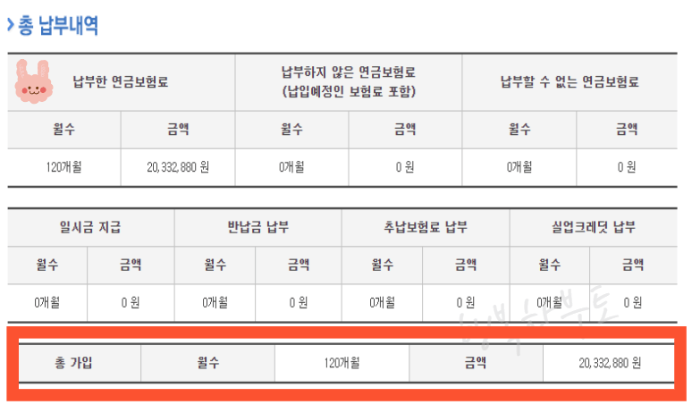 로그인을 하게되면 국민연금 총 납부내역 화면이 나타납니다.