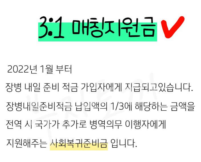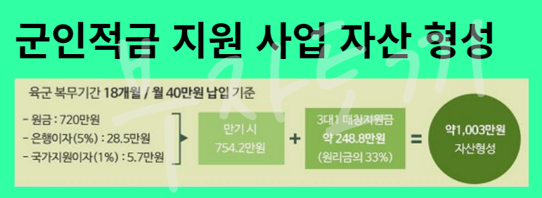 - 가입 기간 : 군 복무 기간 내에만 적립 받을 수 있으므로 제대지 만기해기가 됩니다.