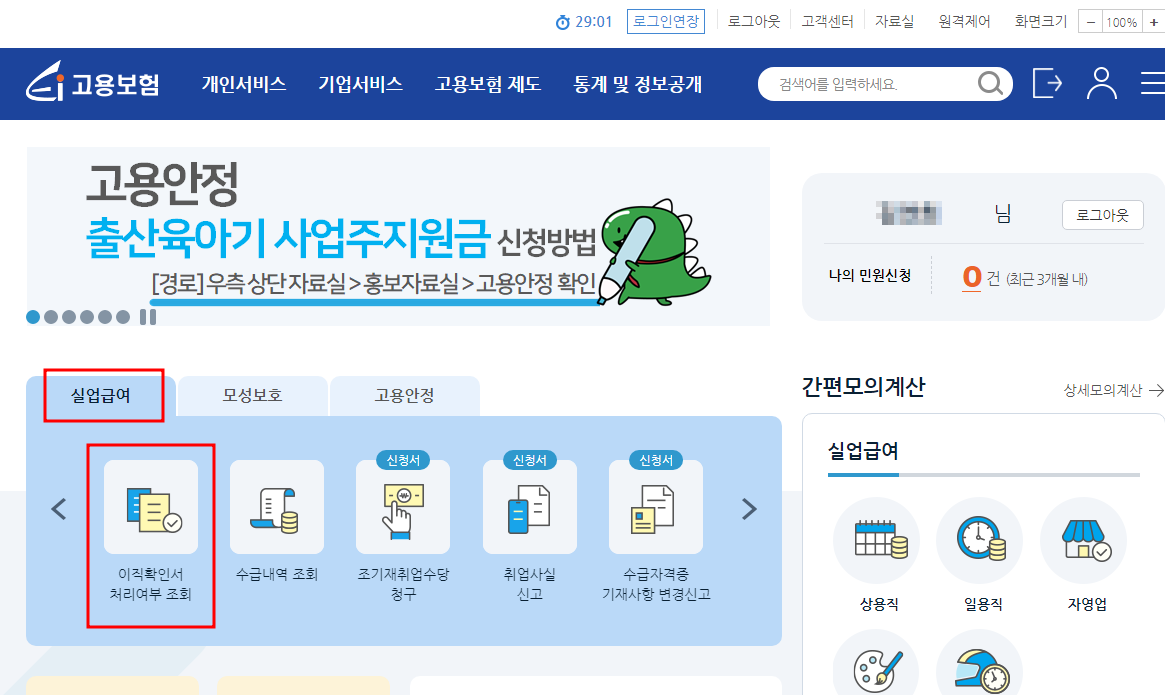 고용보험 홈페이지 로그인 > 실업급여 > 이직확인서 처리여부 조회