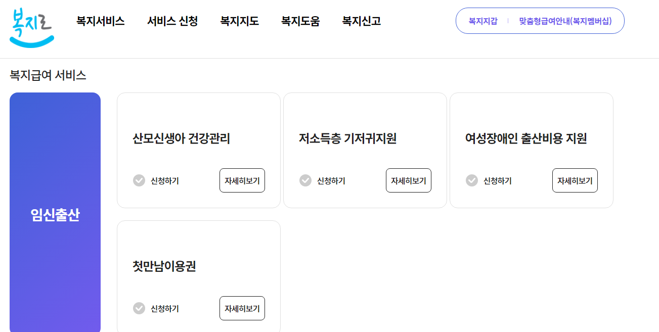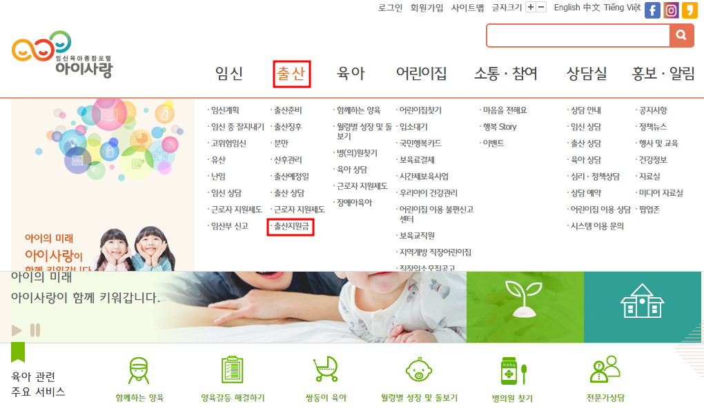 출산으로 마우스를 가져다 놓으면 여러 소카테고리가 나옵니다. 그중 출산지원금 을 클릭합니다