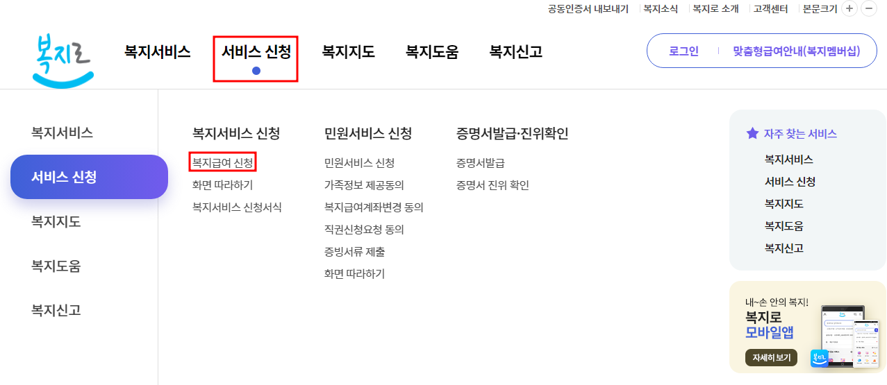 서비스 신청에 마우스를 올려놓으면 카테고리가 펼쳐집니다. 그 카테고리에서 '복지급여 신청'을 클릭해 주세요.
