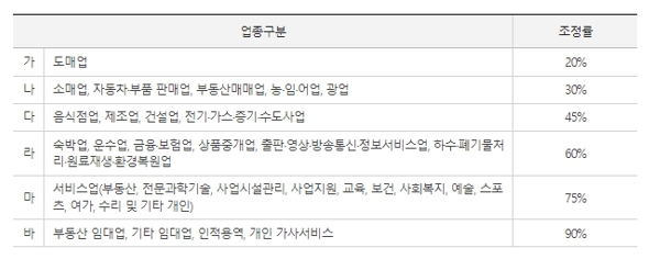 사업소득의 경우 아래 표 이미지처럼 조정률이 업종별에 따라 달라짐을 참고.