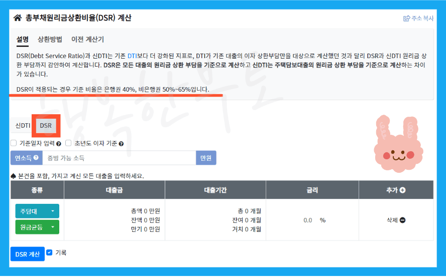 DSR 계산기 활용 시 아래 기준을 알고 계신다면  조듬더 정확하게 DSR을 확인하실 수 있습니다.