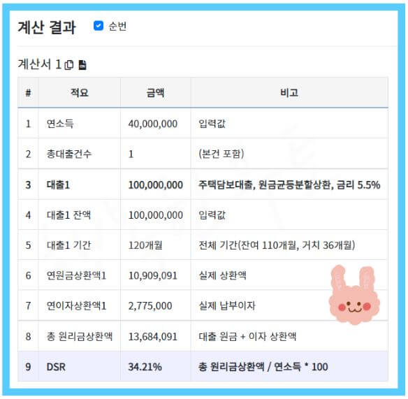 계산이 완료되면 위 이미지와 같이 결과표가 나타납니다. 설정값의  DSR 금액이 34.21%로 나왔습니다.