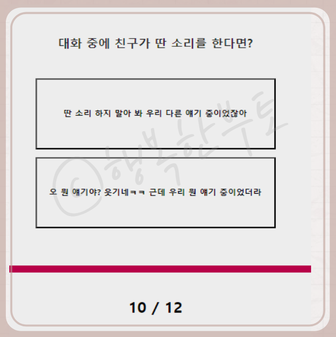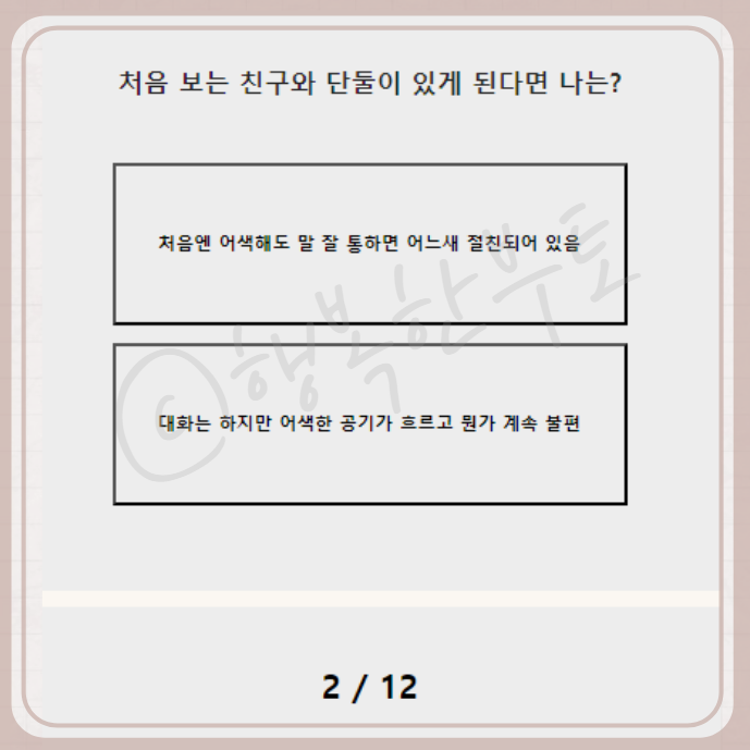 괴로울 것 같습니다. 다음 질문으로는 처음 보는 친구와 단둘이 있게 된다면 나는? 저는 어렸을 적부터 몇 번 만나지 않았던 사람과 함께 식사하는 것을 매우 꺼려했던 성향인지라 생각할 것도 없이 두 번째를 선택했습니다
